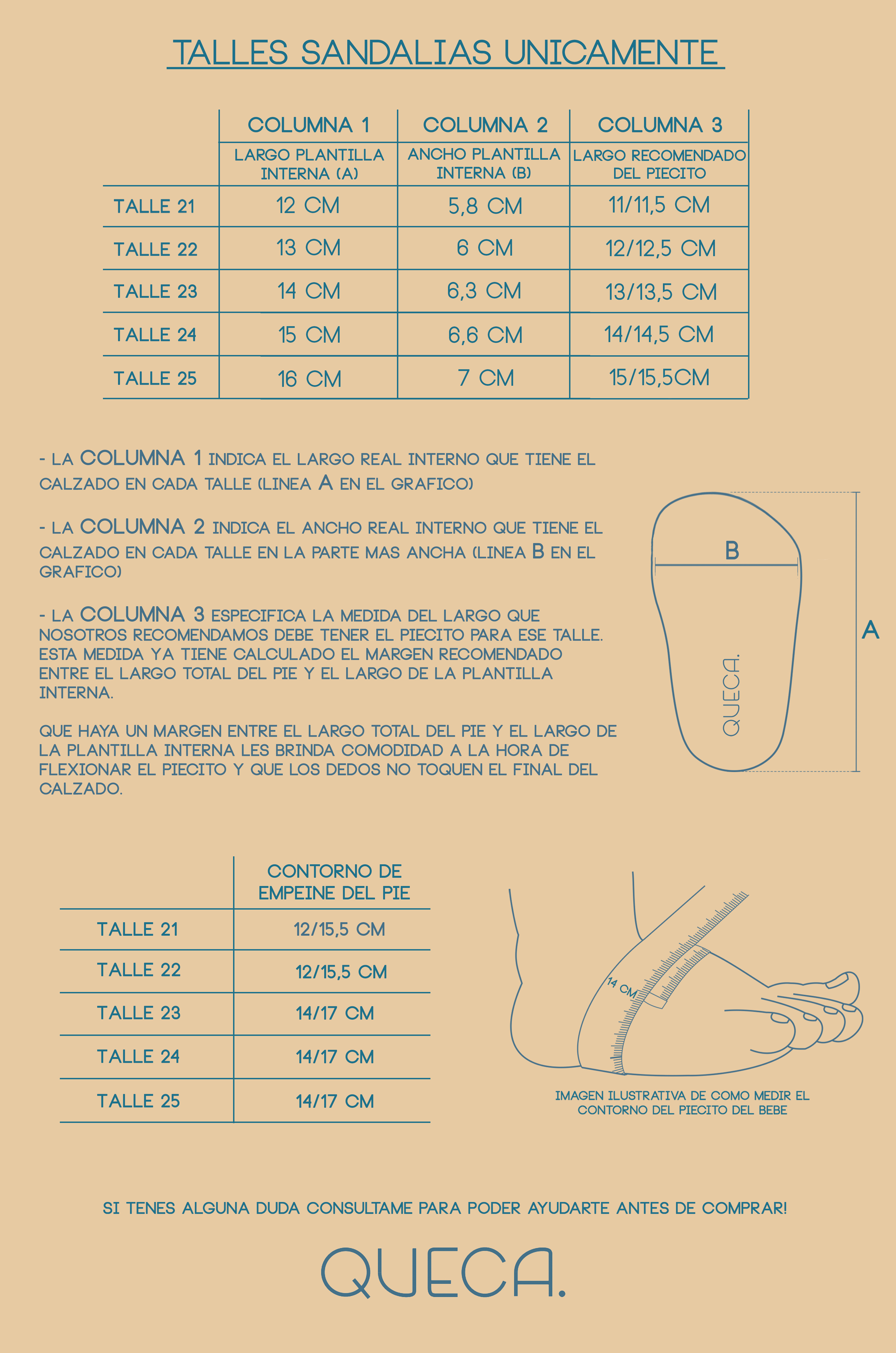Disponibles en 3 talles en este modelo para no caminantes: 0 a 4 meses, 4 a 8 meses y 8 a 12 meses. Los meses son estimativos. Debajo se encuentra la tabla de talles y medidas para que puedas asegurarte de elegir el correcto, se recomienda siempre medir el pie del bebé.