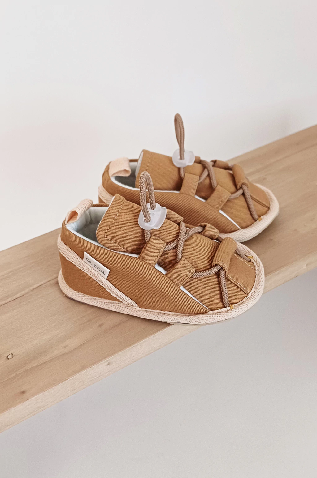 ⦁ Forradas en su interior de jersey de algodón blanco marfil muy suave para la piel del bebé, no tiene costuras internas. Al estar fabricado en tela es un calzado blando que se amolda facilmente a su piecito