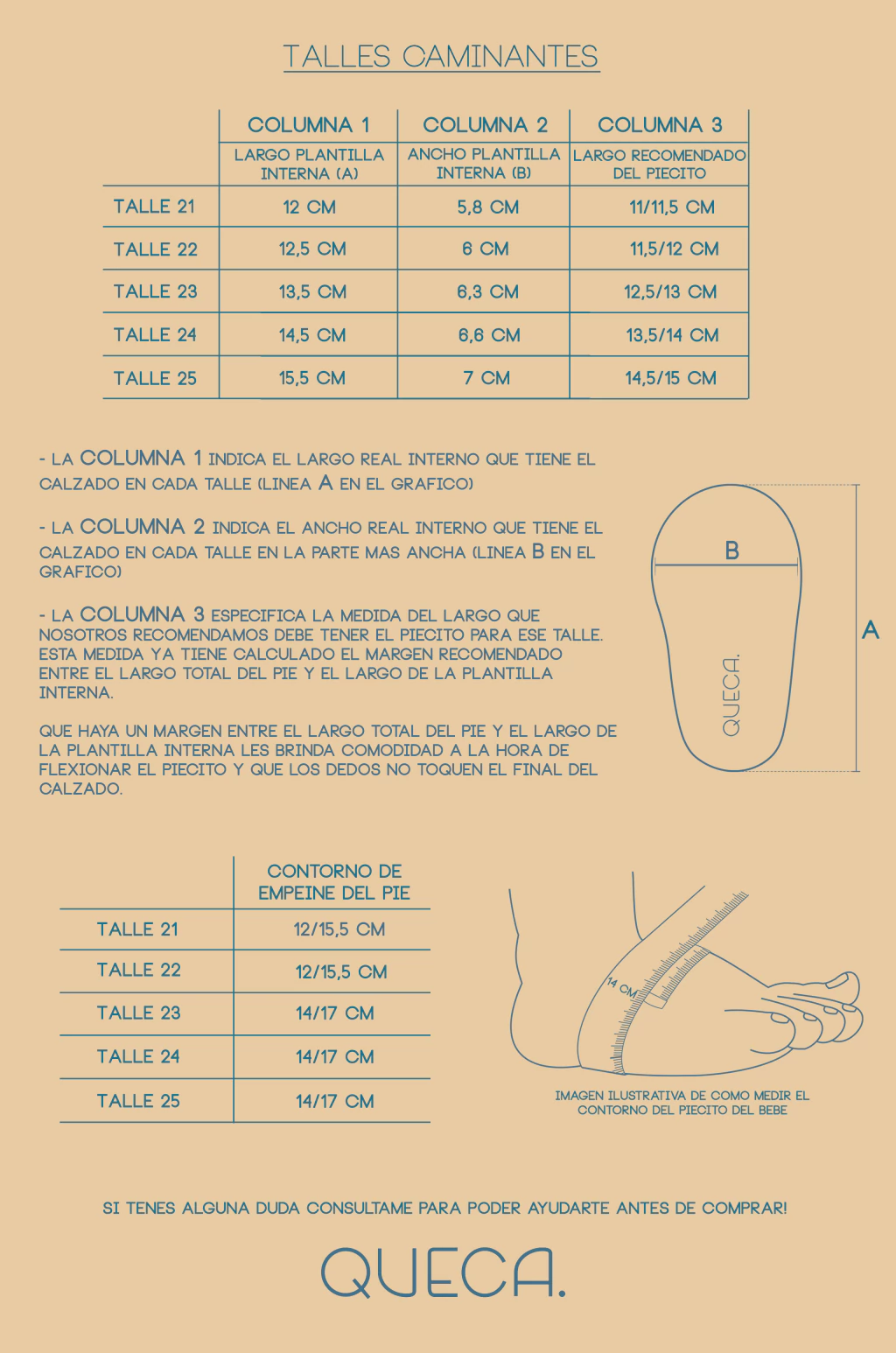Las medidas de los talles entre marcas pueden variar según la horma con la que se fabrica, siempre recomiendo medir el piecito para asegurarse de elegir el talle correcto.
